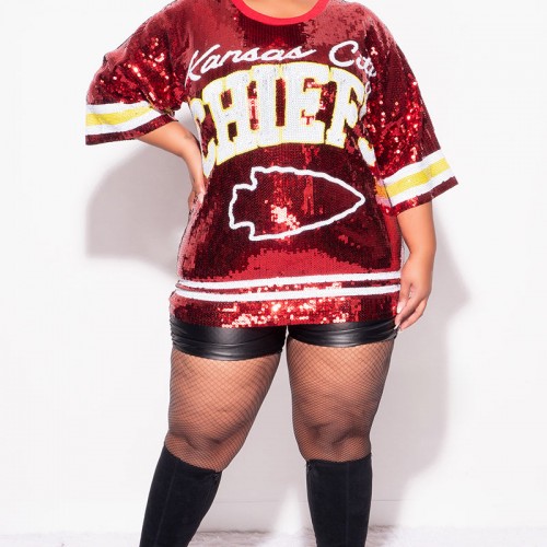 Final Sale Plus Size Sequin Kansas City Chiefs Jersey Top in Red White and Gold One Size Fits Up To 14