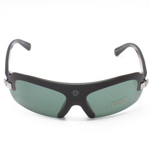 Y2K stunning Versace sunglasses. This half rimmed frame features a grey shield lens, secured to a black frame with magnets and adorned with the iconic Medusa head, delicately imprinted on the lens, adding a touch of sophistication.