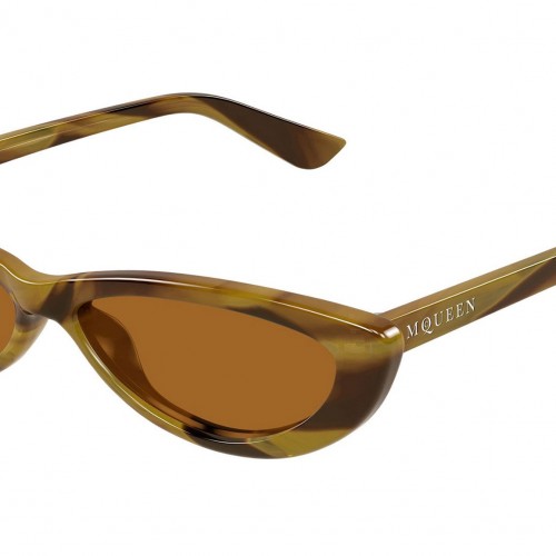Alexander McQueen AM0535S 006 sunglasses for women, featuring shiny yellow striated havana panthos recycled acetate frame and solid rust brown bio nylon lenses. Brand line: Logo. Style code: AM0535S. Color code: 006. Made in Italy. Authorized Alexander McQueen online reseller. Your glasses will include the original case and accessories and are covered by a 12-month global warranty.