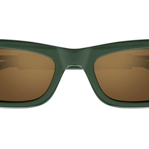 Bottega Veneta sunglasses model BV1308S from Unapologetic eyewear line, color code 003 shiny solid metallic green injection, rectangle frame shape with solid brown + triflection copper – Zeiss lens.