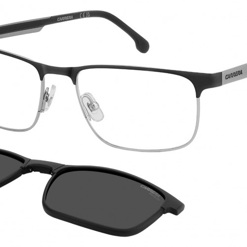 Carrera CA 8921/C RZZ glasses for men, featuring matte black dark ruthenium rectangular metal frame and grey polarized lenses clip. These Carrera optical glasses combine function and style. The front is made of stainless steel, with one version featuring an accent along the top in a different hue. Rubber inserts and the Carrera logo on the temples add a casual touch. Clip-on polarized sun lenses offer maximum freedom. They fold easily and attach with a simple click. Brand line: Sport. Style code: 110263. Color code: RZZ. Authorized Carrera online reseller. Your glasses will include the original case and accessories and are covered by a 12-month global warranty.