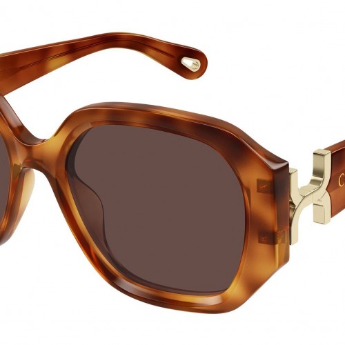 Chloé CH0236S 006 sunglasses for women, featuring shiny blonde havana rectangular recycled acetate frame and solid violet brown bio nylon lenses. Brand line: Chloé. Style code: CH0236S. Color code: 006. Made in Japan. Authorized Chloé Eyewear online reseller. Your glasses will include the original case and accessories and are covered by a 12-month global warranty.