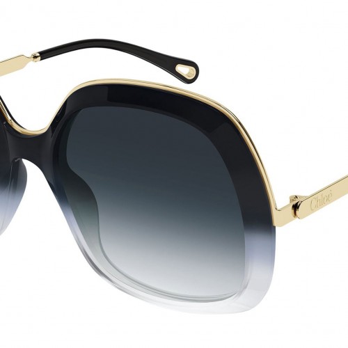 Chloé CH0327S 005 sunglasses for women, featuring shiny gradient opal black to transparent crystal rectangular recycled acetate frame and gradient grey-green bio nylon lenses. Brand line: Chloé. Style code: CH0327S. Color code: 005. Made in Italy. Authorized Chloé online reseller. Your glasses will include the original case and accessories and are covered by a 12-month global warranty.