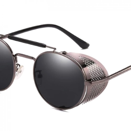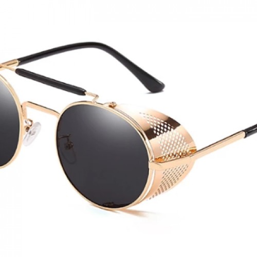 Black round sunglasses with side shields and gold details. Add a fancy vibe to any outfit with these round sunglasses. The sunglasses are quite bulky and heavy, making them feel high-quality and masculine. Nosepads are molded for maximum comfort. The side shields cover eyes from the sides, blocking sun’s rays, wind, and dust. Comes equipped with full UV protection.