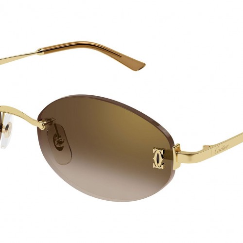 Cartier CT0592S 002 sunglasses for women, featuring smooth golden finish oval metal frame and graded brown with a golden flash nylon lenses. Brand line: Core Range. Style code: CT0592S. Color code: 002. Made in France. Authorized Cartier online reseller. Your glasses will include the original case and accessories and are covered by a 12-month global warranty.
