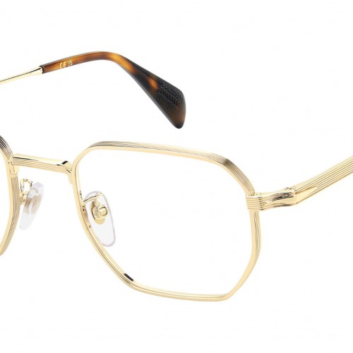 David Beckham DB 1242 RHL glasses for men, featuring gold black rectangular metal frame and demo lens. These Eyewear by David Beckham optical frames are crafted in metal with geometric profiles and sophisticated detailing. The surfaces are embellished by engraved lines, offsetting the iconic Talisman. The lug which connects the front to the temples is unique, sculpted and decisive. The result is a seamless combination of lightweight construction and timeless style. Of the three colourways, the one with gold details is new this season. Brand line: Timeless Icons. Style code: 110764. Color code: RHL. Authorized David Beckham online reseller. Your glasses will include the original case and accessories and are covered by a 12-month global warranty.