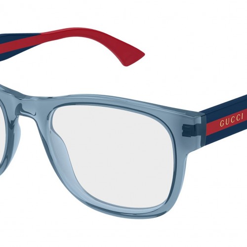 Gucci GG0004ONN 005 glasses for men, featuring shiny transparent petrol blue rectangular recycled acetate frame and demo lenses. Brand line: Institutional Logo. Style code: GG0004ONN. Color code: 005. Made in Japan. Authorized Gucci online reseller. Your glasses will include the original case and accessories and are covered by a 12-month global warranty.