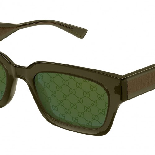 Gucci GG2069S 004 sunglasses for men, featuring shiny transparent green rectangular recycled acetate frame and solid green + petrol mini classic Guccissima logo bio nylon lenses. Brand line: Sign. Style code: GG2069S. Color code: 004. Made in Italy. Authorized Gucci online reseller. Your glasses will include the original case and accessories and are covered by a 12-month global warranty.