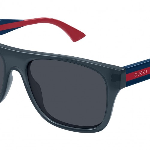 Gucci GG2119S 004 sunglasses for men, featuring shiny transparent blue rectangular recycled acetate frame and solid dark blue bio nylon lenses. Brand line: Sign. Style code: GG2119S. Color code: 004. Made in Japan. Authorized Gucci online reseller. Your glasses will include the original case and accessories and are covered by a 12-month global warranty.