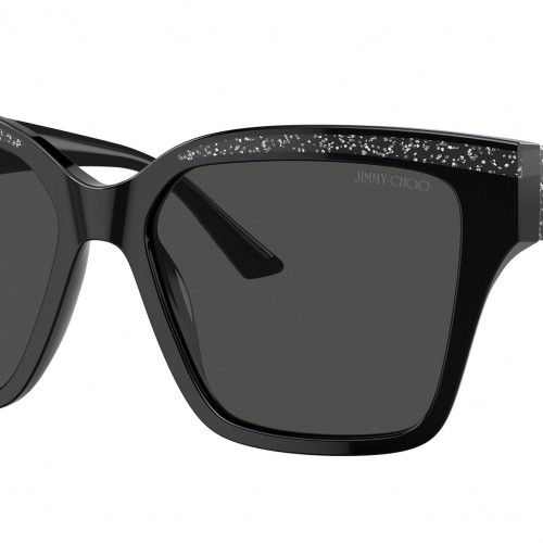 Jimmy Choo JC5003 503687 sunglasses for women, featuring black glitter d-frame acetate frame and dark grey bio polyamide lenses. High bridge fit. Brand line: Crystal. Style code: JC5003. Color code: 503687. Authorized Swarovski online reseller. Your glasses will include the original case and accessories and are covered by a 12-month global warranty.