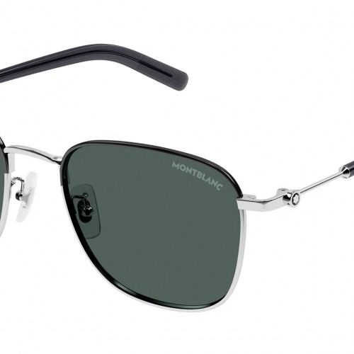 Montblanc MB0392SA 003 sunglasses for men, featuring shiny silver / shiny dark ruthenium rectangular metal frame and solid green bio nylon lenses. Brand line: Snowcap. Style code: MB0392SA. Color code: 003. Made in Japan. Authorized Montblanc online reseller. Your glasses will include the original case and accessories and are covered by a 12-month global warranty.
