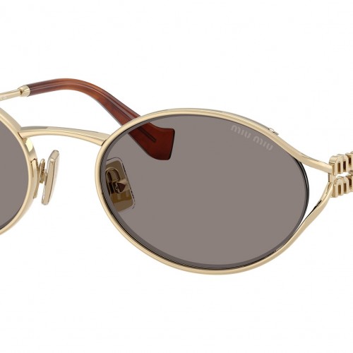 Miu Miu MU 52YS ZVN80Q sunglasses for women, featuring pale gold oval metal frame and dark grey bio polyamide lenses. High bridge fit. Brand line: Irreverently Sophisticated. Style code: 0MU 52YS. Color code: ZVN80Q. Made in Italy. Authorized Miu Miu online reseller. Your glasses will include the original case and accessories and are covered by a 12-month global warranty.