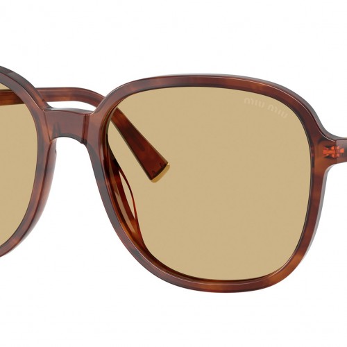 Miu Miu MU B01S 26E10R sunglasses for women, featuring striped tobacco d-frame acetate frame and yellow bio polyamide lenses. High bridge fit. Brand line: Main Collection. Style code: 0MU B01S. Color code: 26E10R. Made in Italy. Authorized Miu Miu online reseller. Your glasses will include the original case and accessories and are covered by a 12-month global warranty.