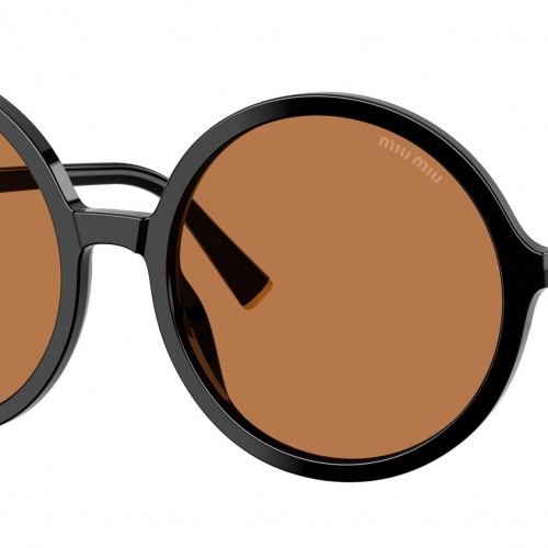 Miu Miu MU B02S 16K90Q sunglasses for women, featuring black round acetate frame and brown bio polyamide lenses. High bridge fit. Brand line: Main Collection. Style code: 0MU B02S. Color code: 16K90Q. Made in Italy. Authorized Miu Miu online reseller. Your glasses will include the original case and accessories and are covered by a 12-month global warranty.