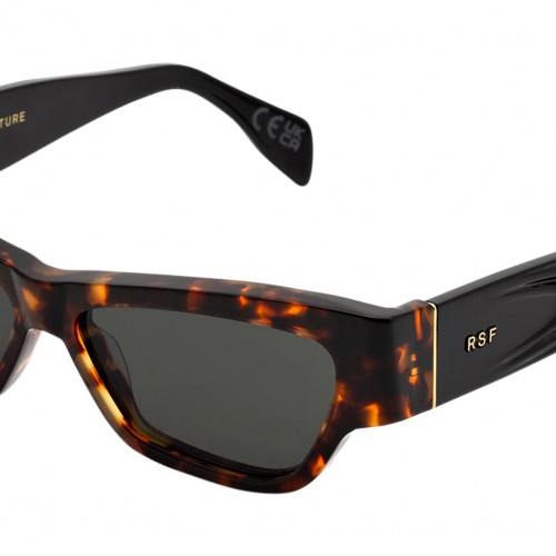 Nameko is an edgy and mischievous eyewear piece that embodies RSF’s playful design approach. With a low-riding, wide silhouette, the frame includes a thick brow-line and sturdy geometric frontal frame. The lower half of the frame features slanted, thinner rims. Notably, Nameko stands out with its unique and otherworldly thermoform design on the temples, making it a distinctive and contemporary eyewear piece. This version comes in a rich burnt Havana acetate and black lenses. Sizes: R Lens Width: 56 mm. Frame Front: Frame Side: 140 mm. Product Code Size R: XWN