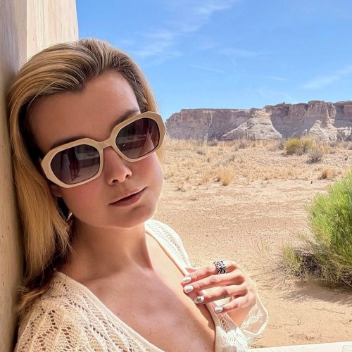 Meet Nina, the perfect mix of style and functionality. Featuring a fine angled design in beige with brown fade lenses, Nina offers 100% UV protection. With raised gold logo and hinges, this sunglass is perfect for oval, round, and heart face shapes. Make a statement with Nina!