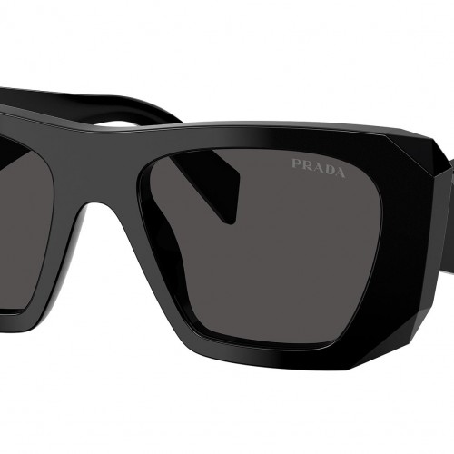 Prada PR B18S 16K08Z sunglasses for women, featuring black squared acetate frame and dark grey bio polyamide lenses. High bridge fit. Brand line: Design. Style code: PRB18S. Color code: 16K08Z. Made in Italy. Authorized Prada online reseller. Your glasses will include the original case and accessories and are covered by a 12-month global warranty.