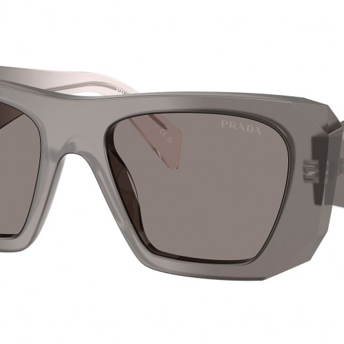 Prada PR B18S 20F80Q sunglasses for women, featuring grey squared acetate frame and dark grey bio polyamide lenses. High bridge fit. Brand line: Design. Style code: PRB18S. Color code: 20F80Q. Made in Italy. Authorized Prada online reseller. Your glasses will include the original case and accessories and are covered by a 12-month global warranty.