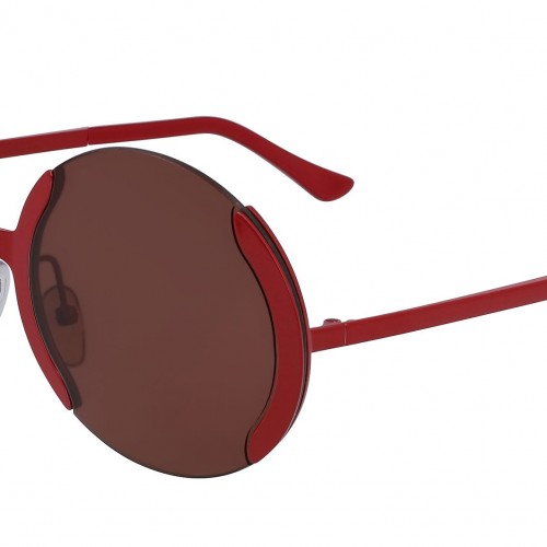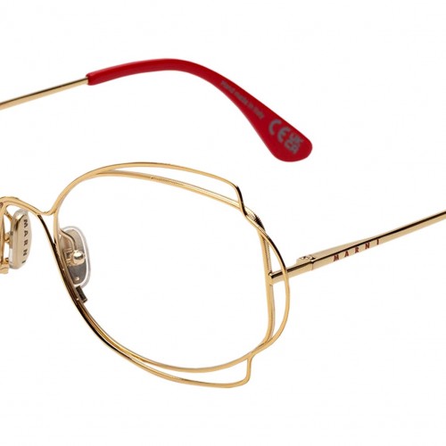 Designed exclusively for Marni, Route of the Sun is a playful optical frame inspired by Art Deco references. The silhouette features an all-metal construction with decorative metal wire encasing its oval lenses and forming an abstract floral shape. Sleek temples with acetate tips complete this unique lightweight frame that comes in a gold finish with red acetate detailing. Sizes: R Lens Width: 58 mm. Frame Front: Frame Side: 135 mm. Product Code Size R: BXL