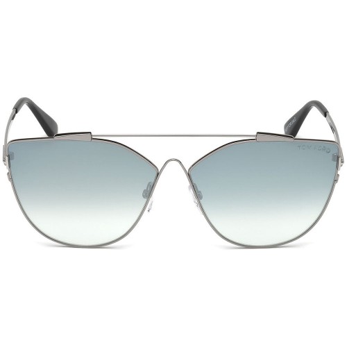 Tom Ford Jacquelyn Cat Eye Style Women’s Sunglasses Having Shiny Light Ruthenium Color Metal Frame With Blue Mirrored Lens.